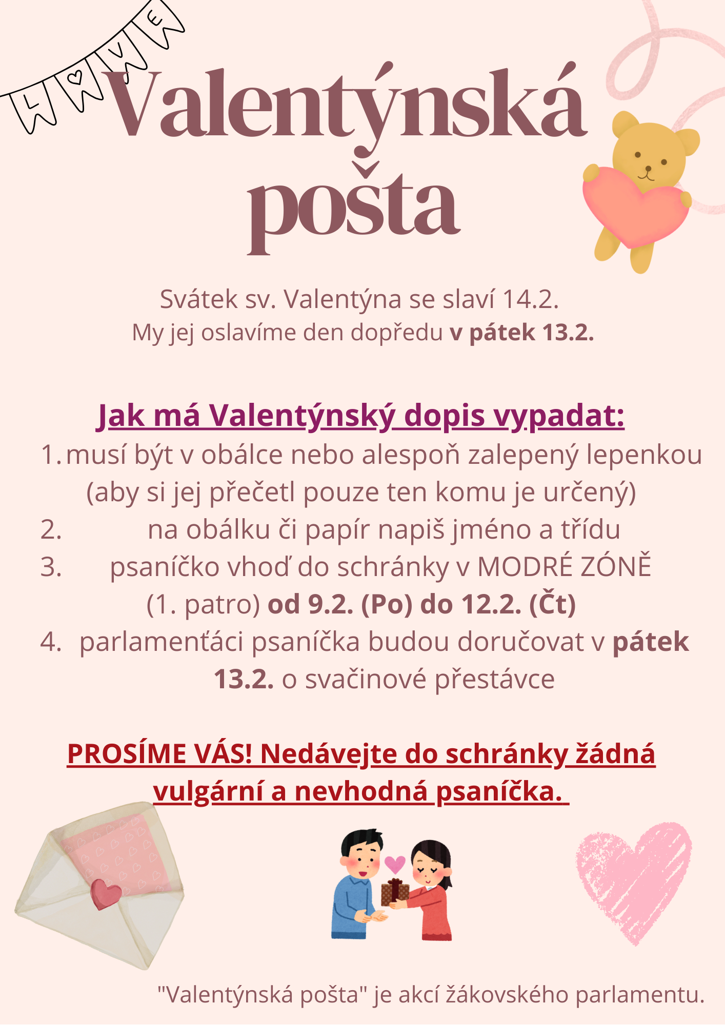 Žákovský parlament si připravil pro žáky ZŠ valentýnskou poštu, jejímž prostřednictvím si mohou navzájem se spolužáky poslat milá psaníčka.![]()
