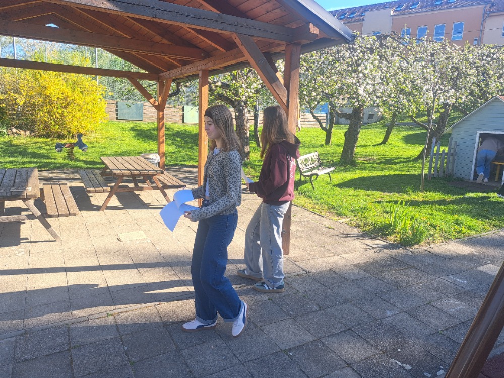 Část programu probíhala také venku na školním hřišti, kde žáci ve skupinách vyhledávali indicie spojené se životem obou kněží, skládali jednotlivé informace do souvislostí a doplňovali pracovní listy.